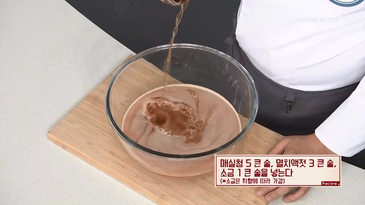 4. 면포에 거른 육수에 매실청 5큰술, 멸치액젓 3큰술, 소금 1큰술을 넣어줍니다. (소금은 취향에 따라 가감합니다.)