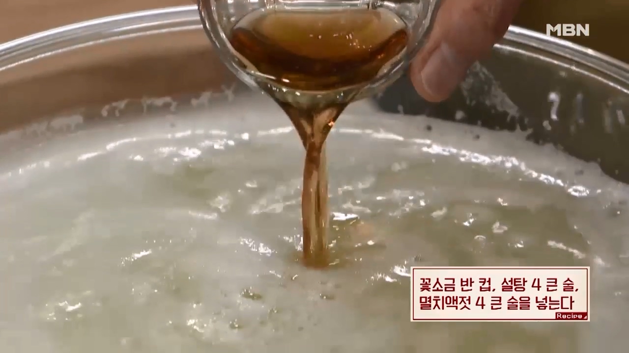 7. 꽃소금 반 컵, 설탕 4큰술, 멸치액젓 4큰술을 넣습니다.
