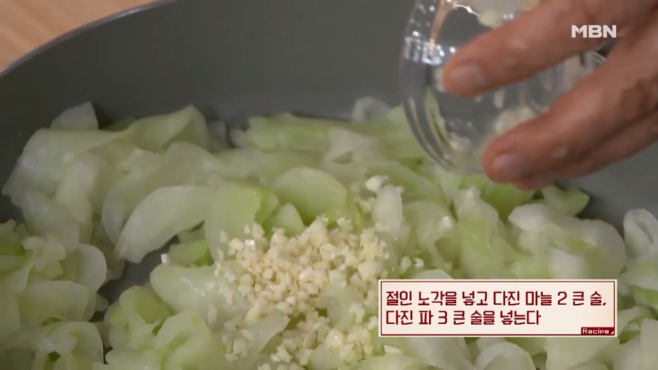 7. 절인 노각을 넣고 다진 마늘 2큰술, 다진 파 3큰술을 넣어줍니다.