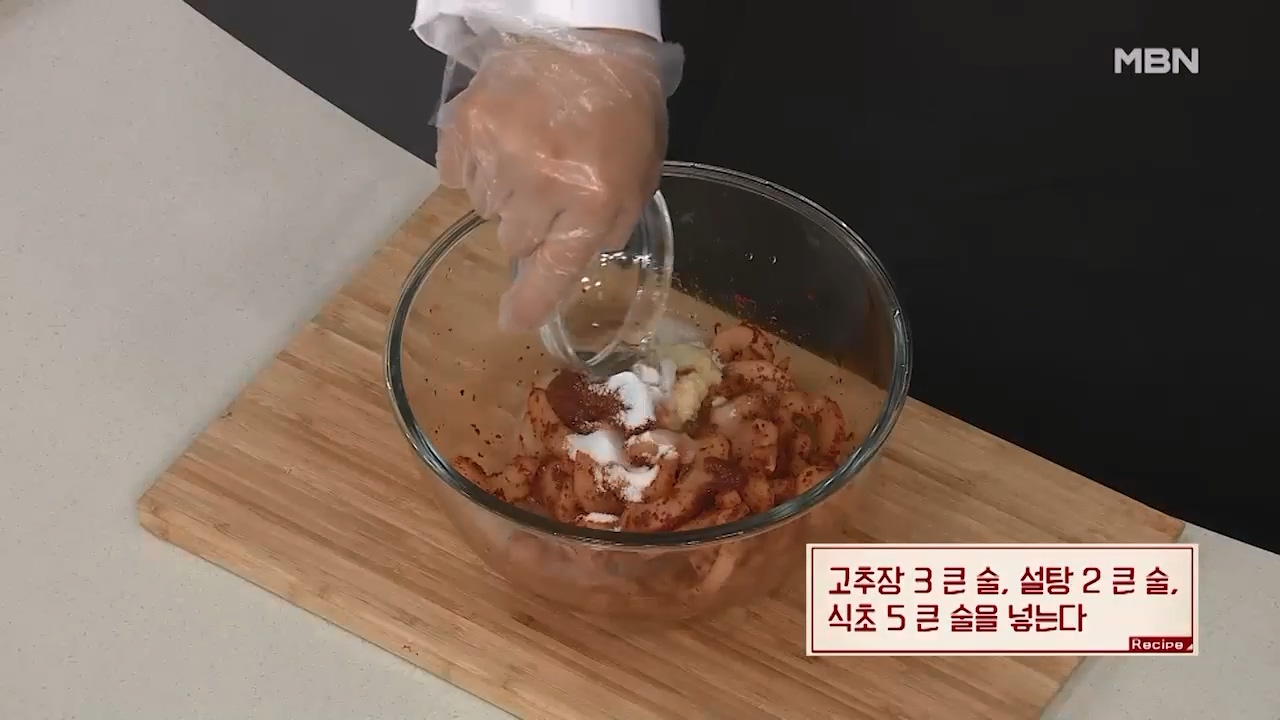 4. 고추장 3큰술, 설탕 2큰술, 식초 5큰술을 넣어줍니다.
