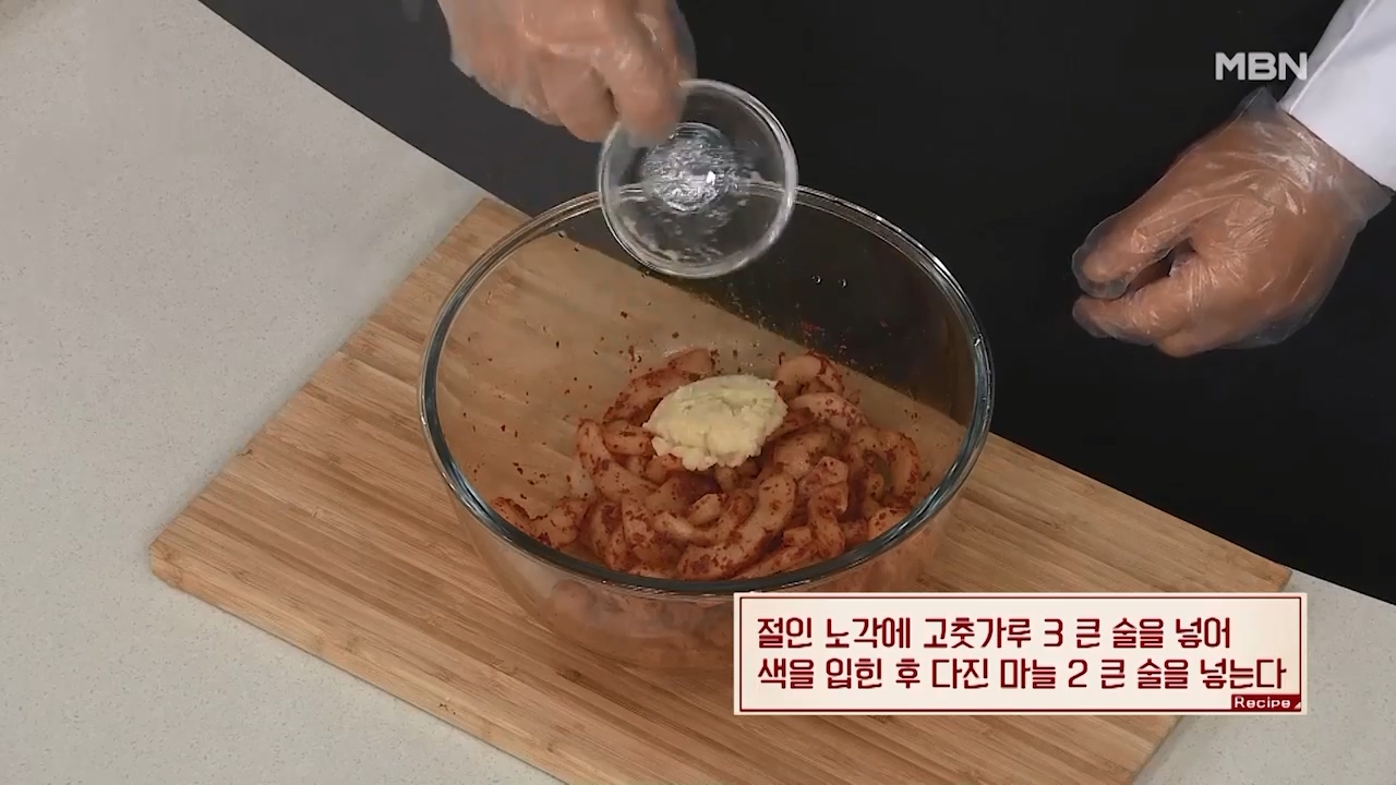 3. 절인 노각에 고춧가루 3큰술을 넣고 버무린 후 다진 마늘 2큰술을 넣어 줍니다.