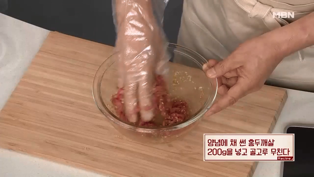 12. 양념에 채 썬 홍두깨살 200g을 넣고 골고루 무쳐줍니다.