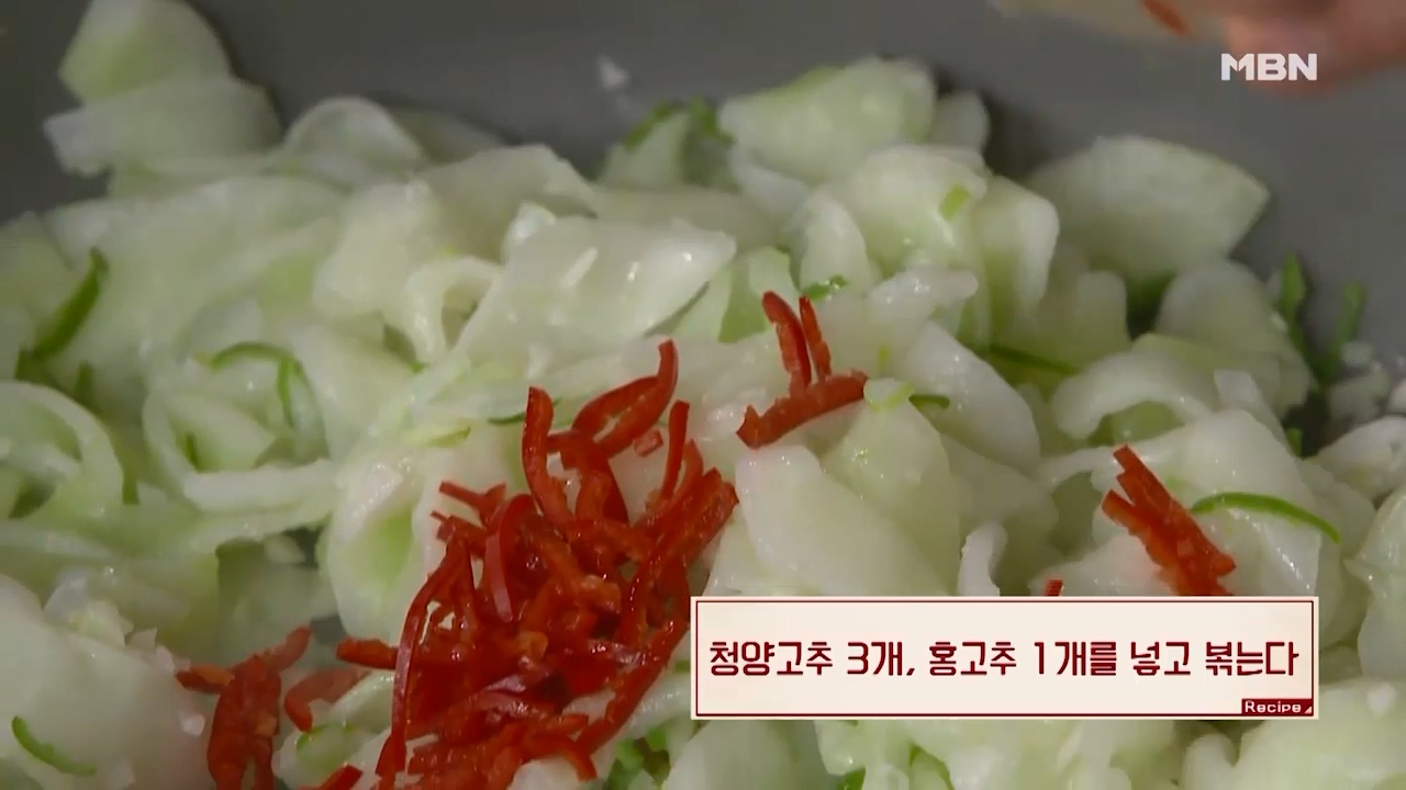 8. 청양고추 3개, 홍고추 1개를 넣고 볶아줍니다.