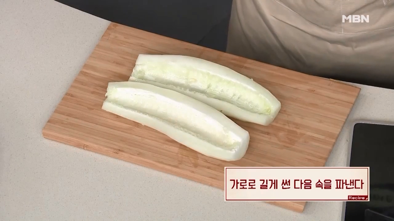 2. 노각을 가로로 길게 썬 다음 속을 파냅니다.