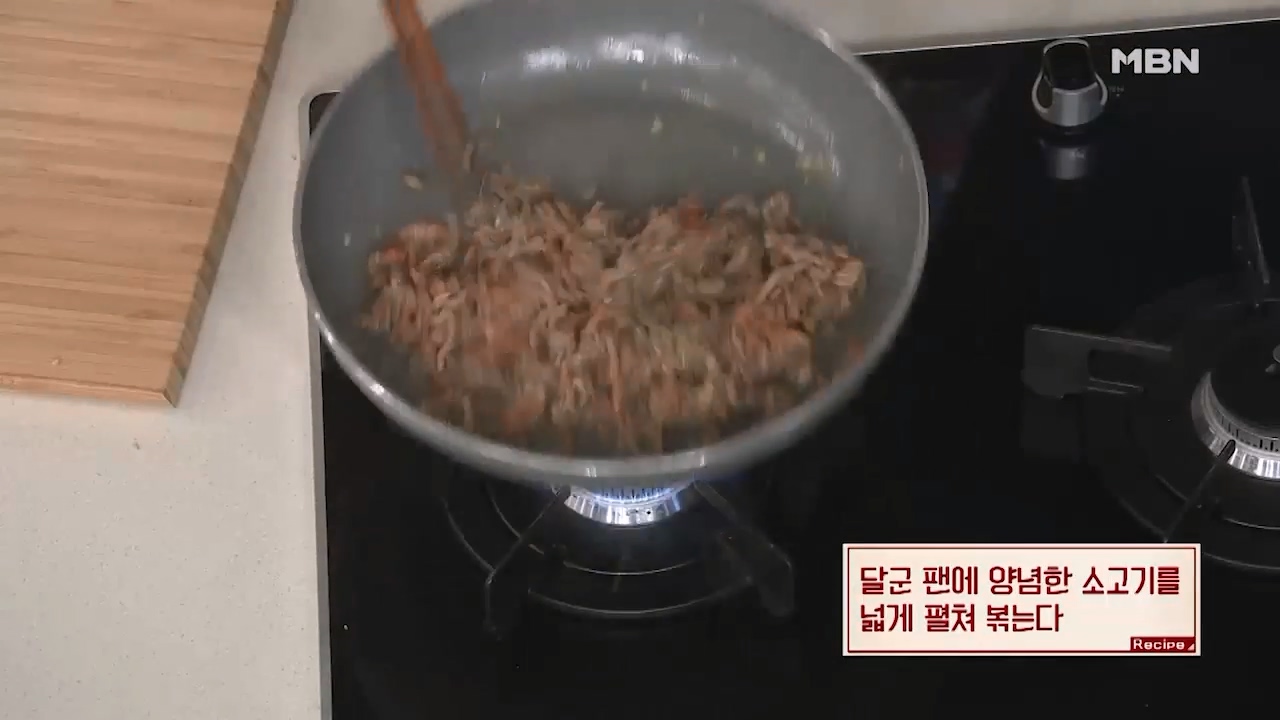 13. 달군 팬에 양념한 소고기를 넓게 펼쳐 볶아줍니다.