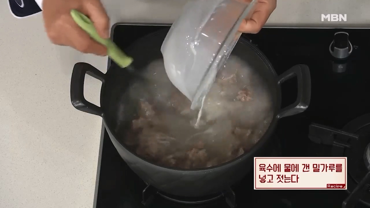 13. 육수에 물에 갠 밀가루를 넣고 저어줍니다.