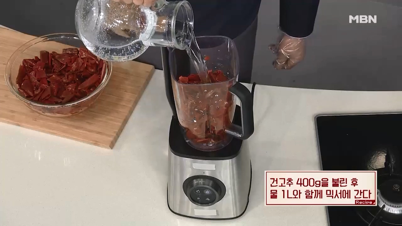 6. 건고추 400g을 불린 후 물 1리터와 함께 믹서기에 갈아줍니다.