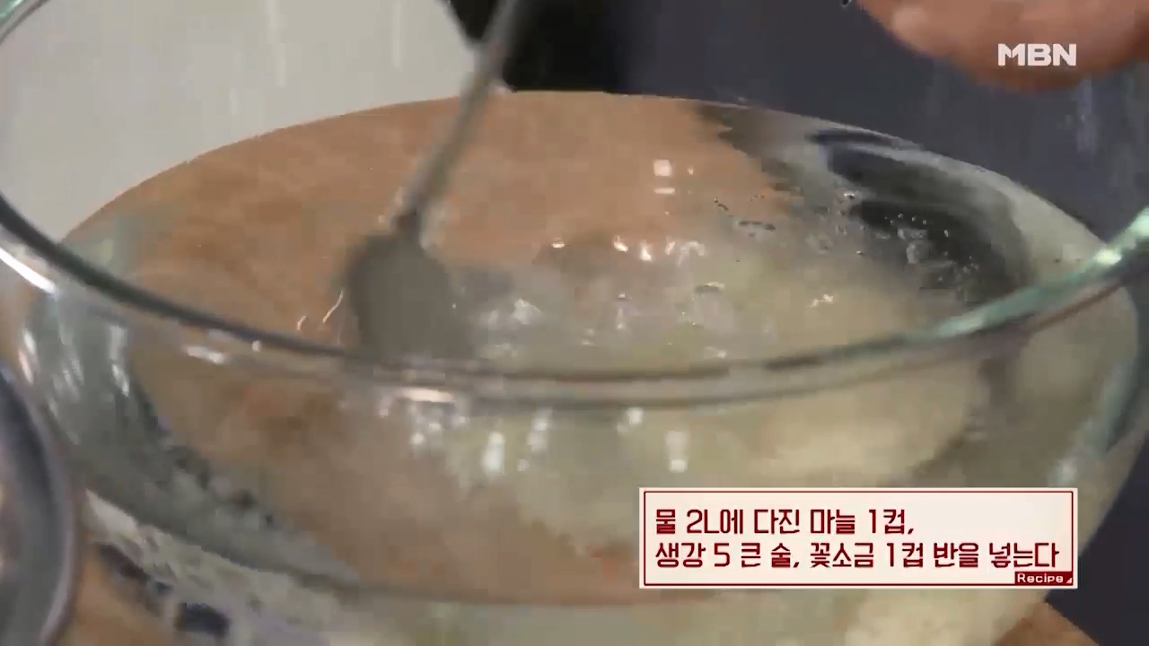 8. 물 2리터에 다진마늘 1컵, 생강 5큰술, 꽃소금 1컵 반을 넣습니다.