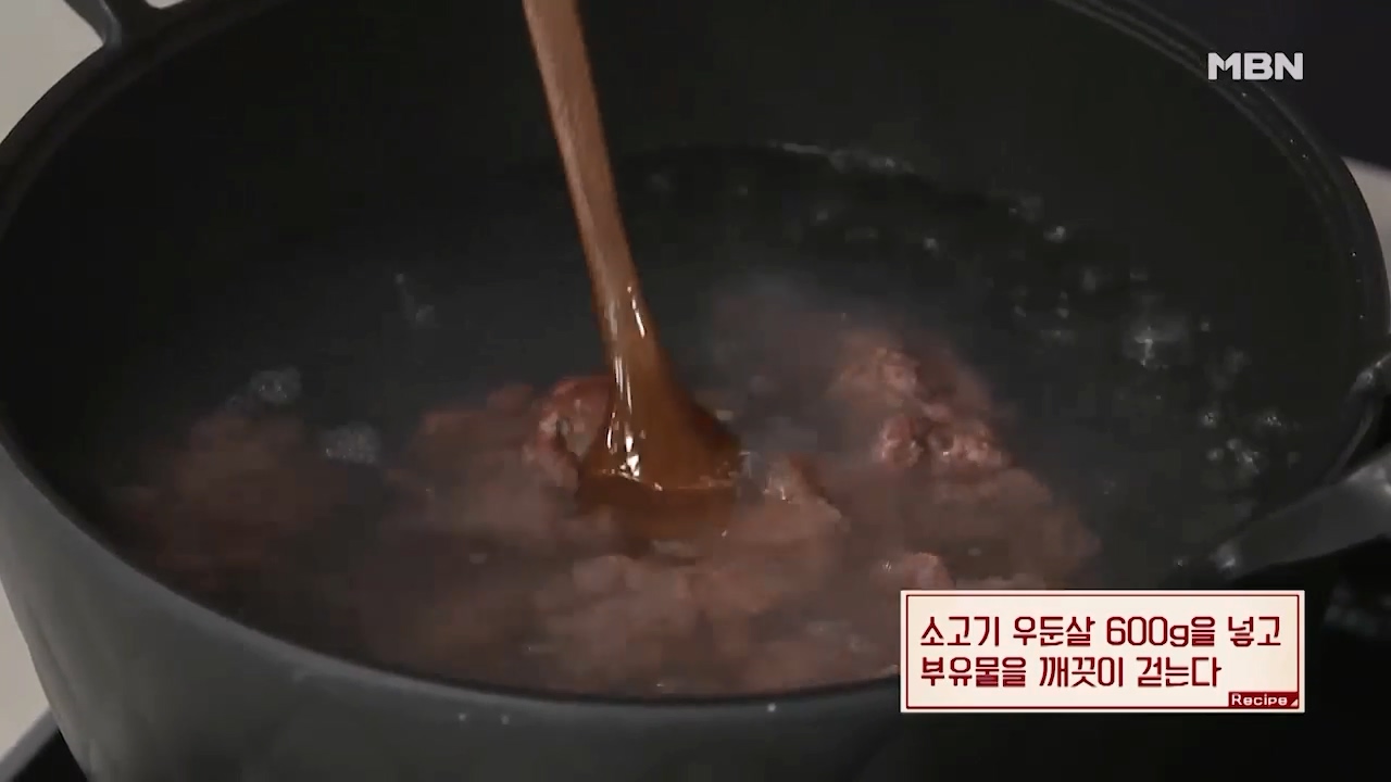 11. 소고기 우둔살 600g을 넣고 부유물을 깨끗이 걷어냅니다. (다진고기를 넣어서 육수를 내면 깊은 감칠맛을 낸다고 합니다.)