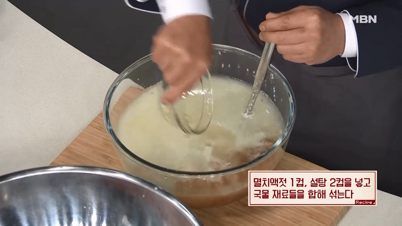 15. 국물과 뜨거운 상태의 육수를 섞어줍니다. (다진고기를 육수와 함께 넣어도 되고 고기를 빼고 육수만 넣어도 된다고 합니다.)