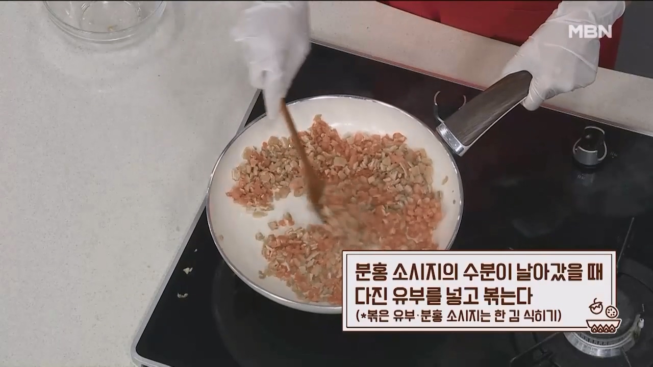 6. 분홍소시지의 수분이 날아갔을때 다진 유부를 넣고 볶아준 후 볶은 유부와 분홍소시지는 한김 식혀줍니다.