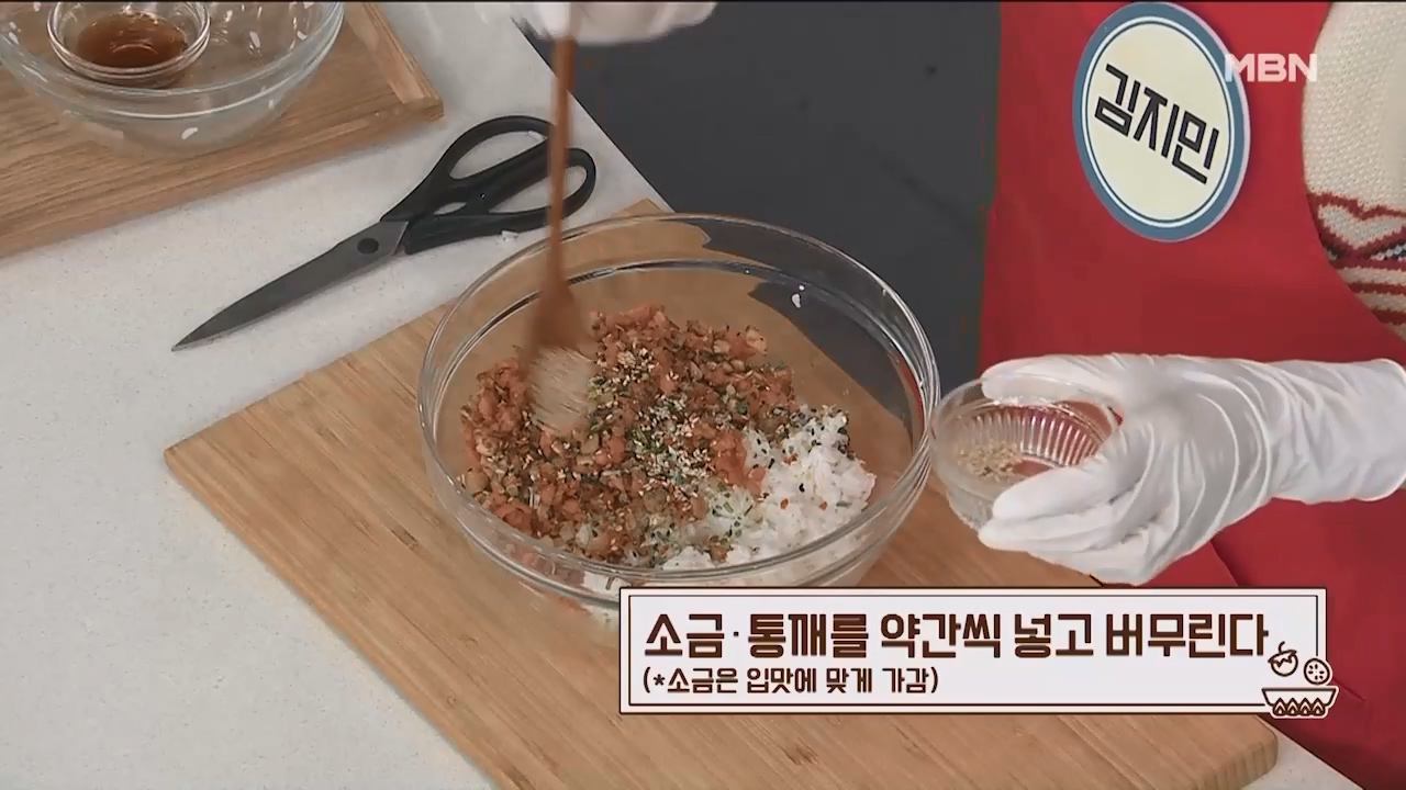 10. 소금과 통깨를 약간씩 넣고 잘 섞어줍니다. (소금은 입맛에 맞게 가감)