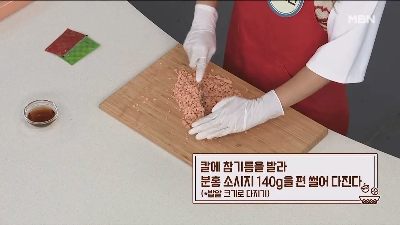 3. 칼에 참기름을 발라 분홍소시지 140g을 편 썰어 밥알 크기로 다져줍니다.