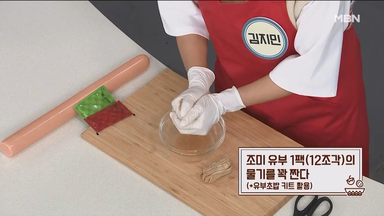 1. 조미 유부 1팩(12조각)의 물기를 꽉 짭니다. (시중에 파는 유부초밥 키트를 활용합니다.)