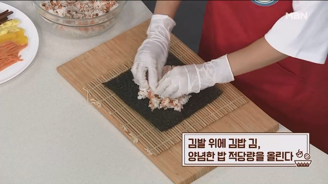 11. 김발 위에 김밥 김, 양념한 밥 적당량을 올립니다.