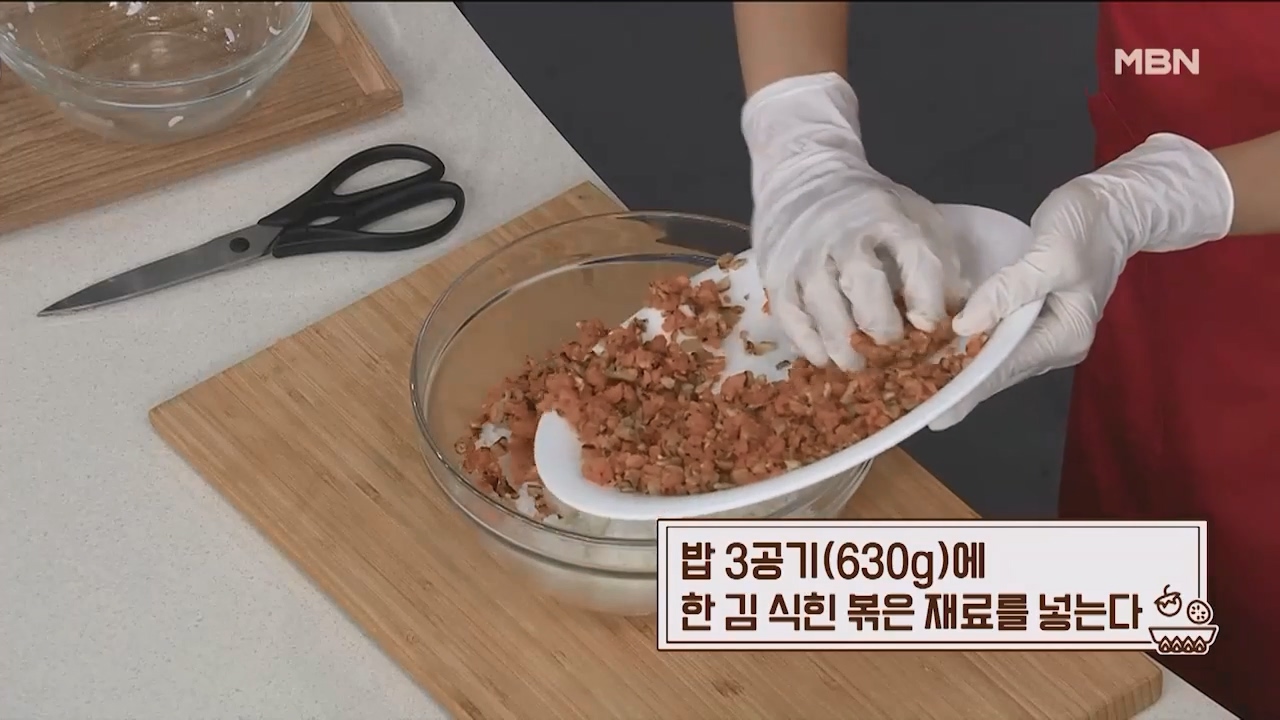 7. 밥 3공기(630g)에 한 김 식힌 볶은 재료를 넣어줍니다.