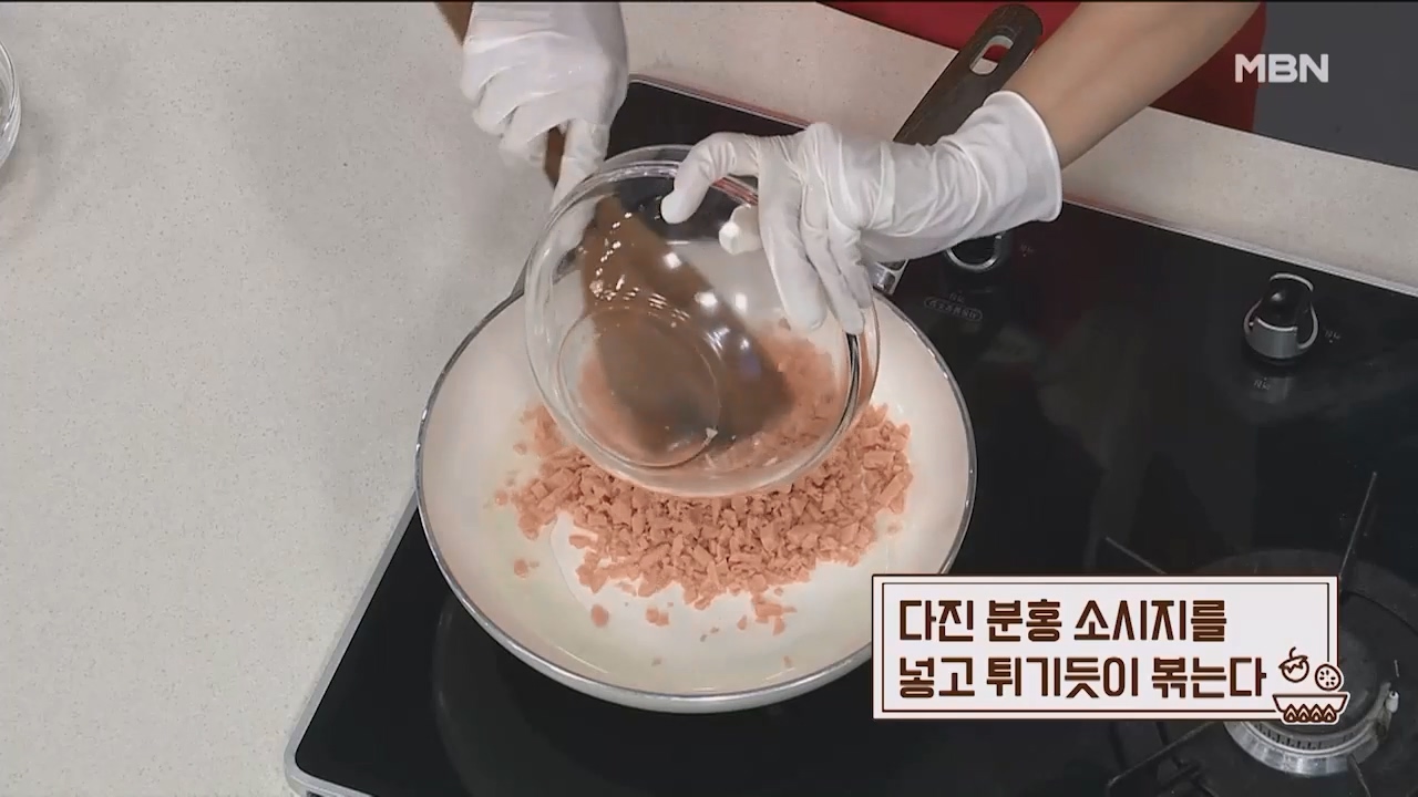 5. 다진 분홍소시지를 넣고 튀기듯이 볶아줍니다.