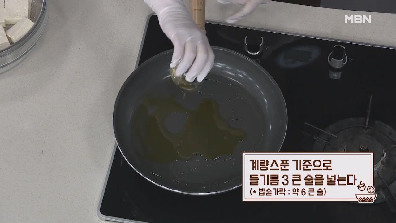9. 달군 팬에 계량스푼 기준으로 식용유 2큰술을 넣습니다. (밥숟가락 약 4큰술)