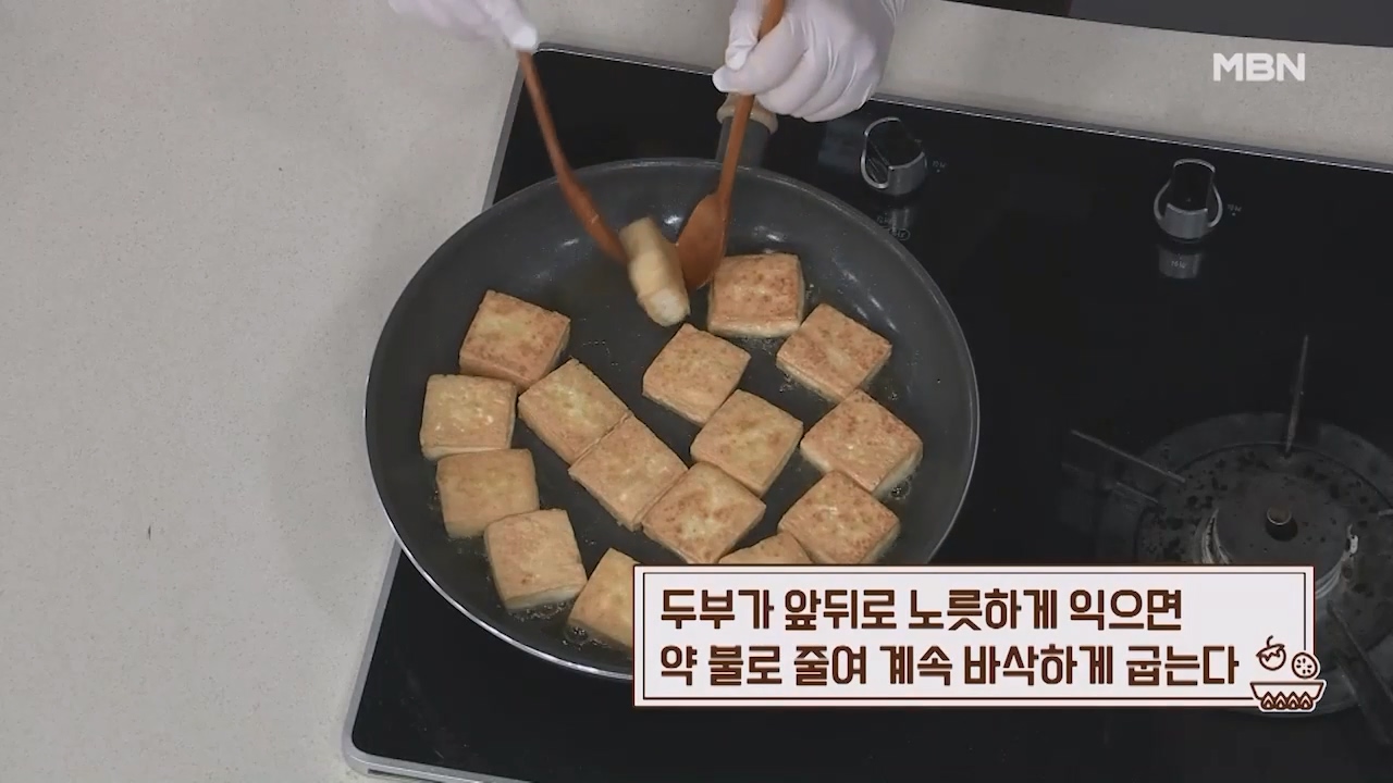 11. 수분 제거한 두부를 올려 앞뒤로 노릇하게 바싹 구워줍니다.