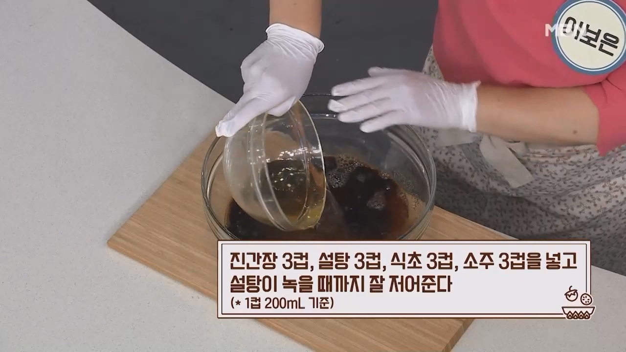 4. 진간장 3컵, 설탕 3컵, 식초 3컵, 소주 3컵을 넣고 설탕이 녹을때까지 잘 섞어줍니다. (1컵 200mL 기준)