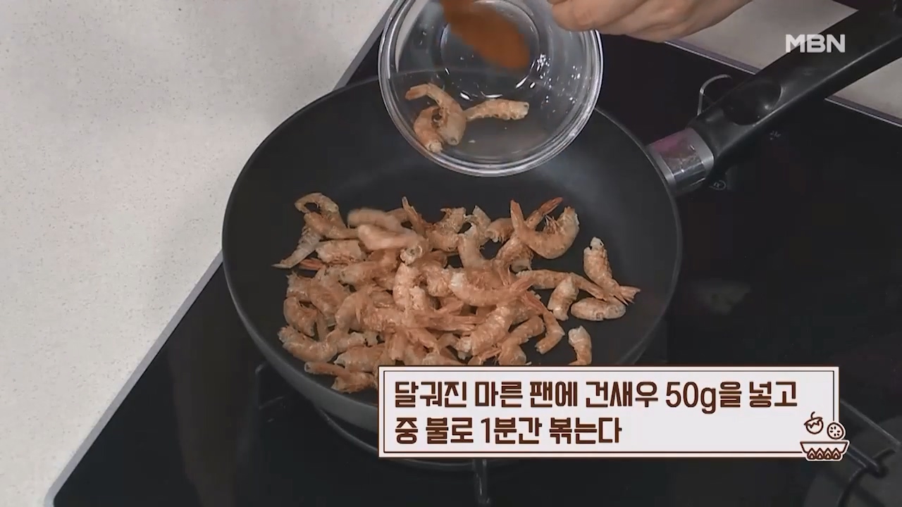 1. 달궈진 마른 팬에 건새우 50g을 넣고 중불로 1분간 볶아줍니다.