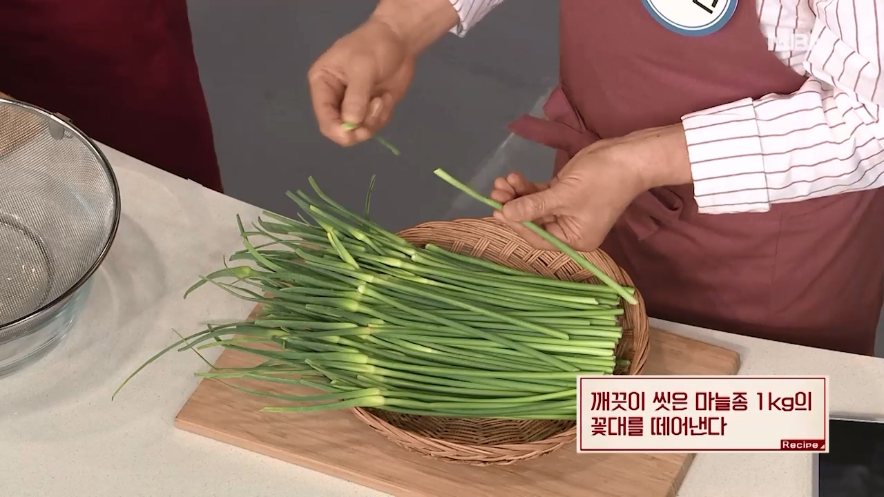 1. 깨끗이 씻은 마늘쫑 1kg의 꽃대를 제거합니다.