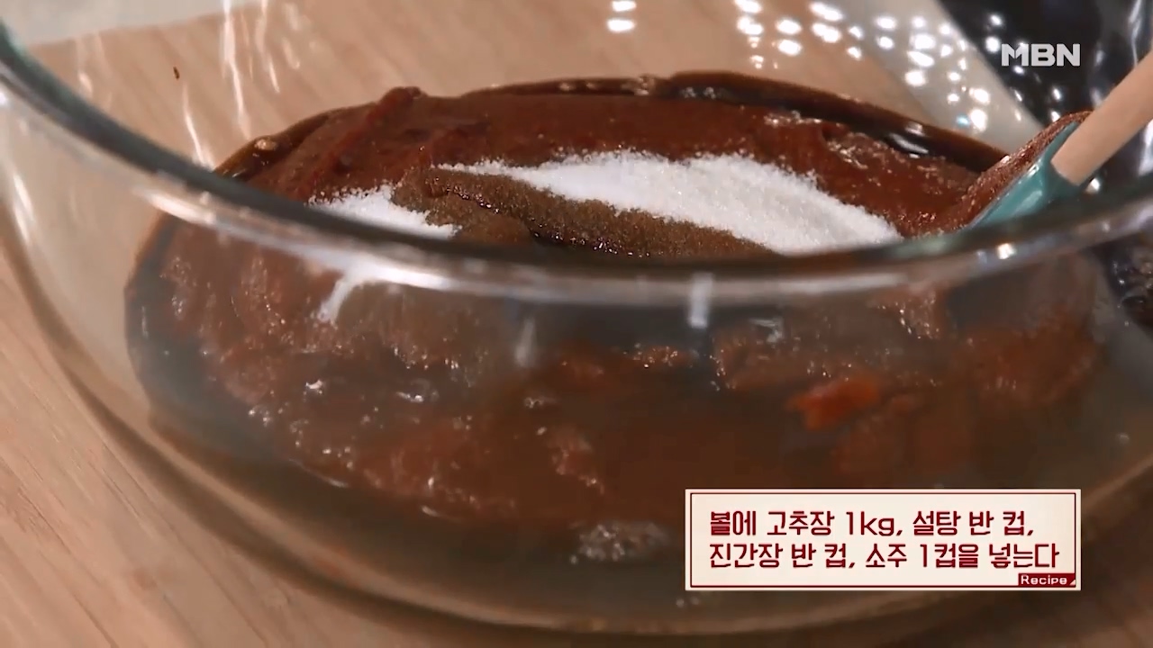 6. 볼에 고추장 1kg, 설탕 반컵, 진간장 반컵, 소주 1컵을 넣습니다.