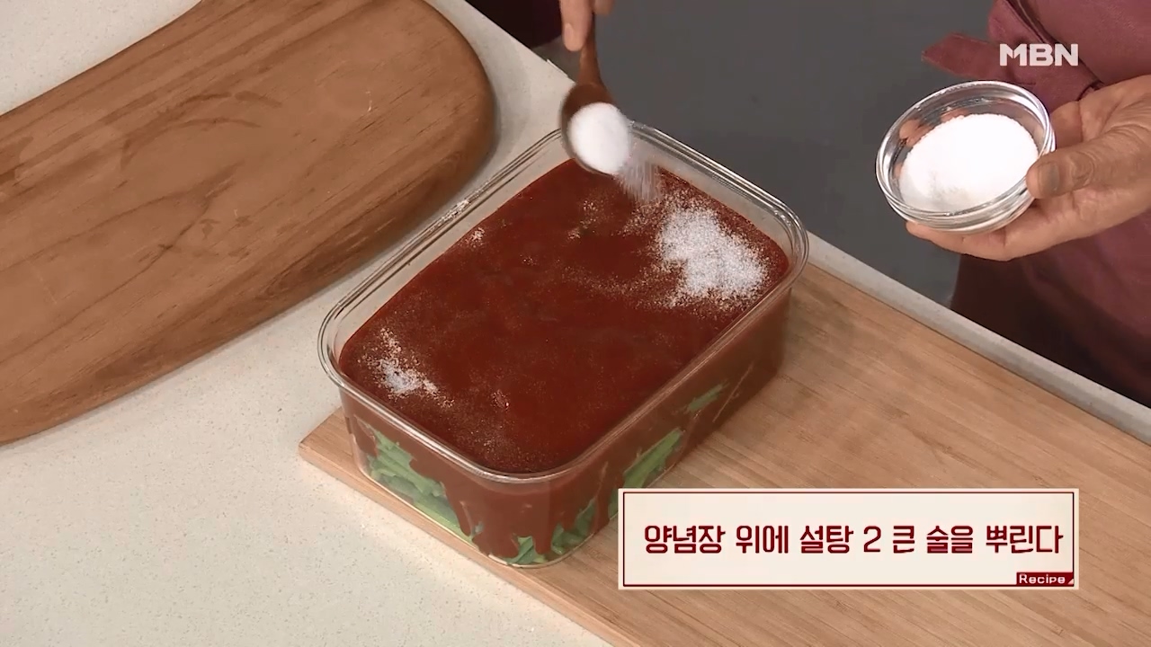 9. 양념장 위에 설탕 2큰술을 뿌리고 숙성시키면 고추장마늘종장아찌가 완성됩니다.