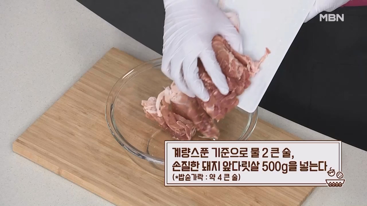 4. 계량스푼 기준으로 물 2큰술, 손질한 돼지 앞다릿살 500g을 넣습니다. (밥숟가락 약 4큰술)