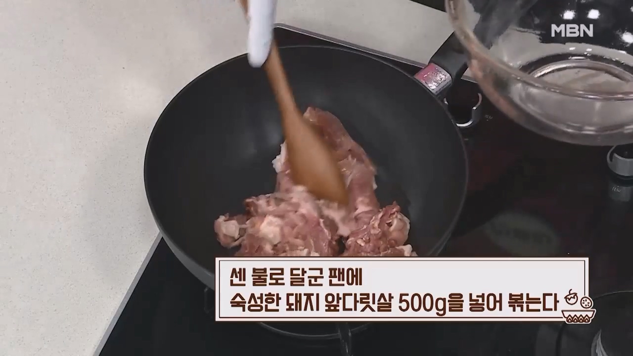 17. 센불로 달군 팬에 숙성한 돼지 앞다릿살 500g을 넣어 볶아줍니다.
