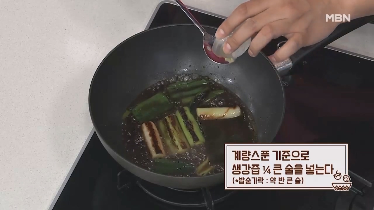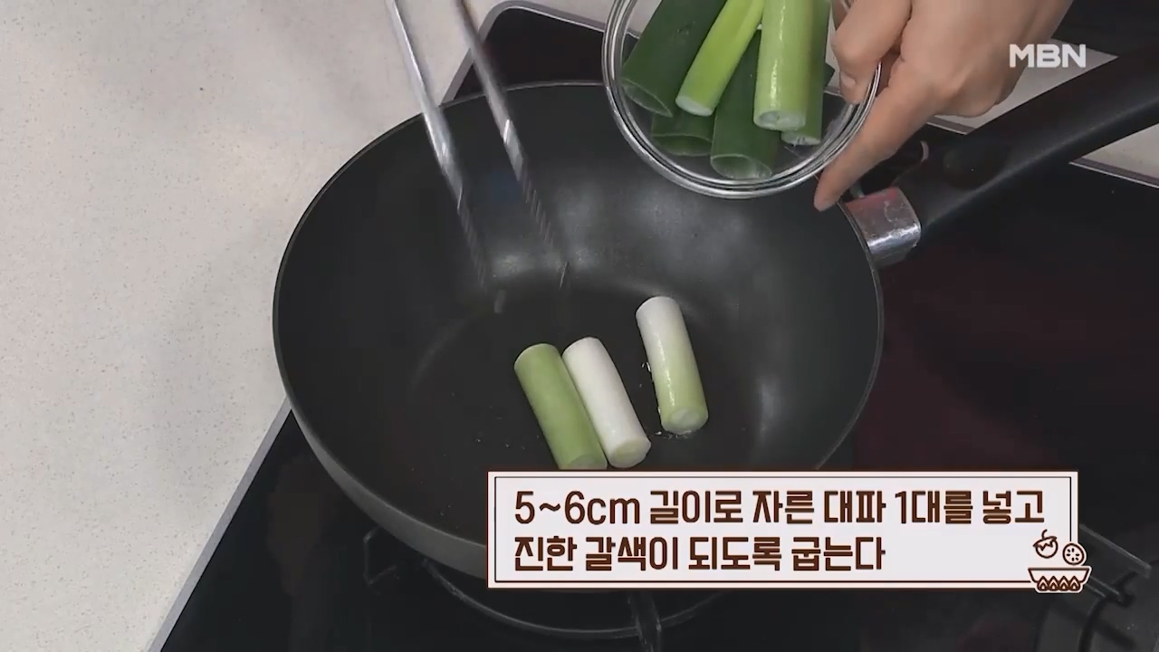 7. 5~6cm 길이로 자른 대파 1대를 넣고 진한 갈색이 되도록 굽습니다.