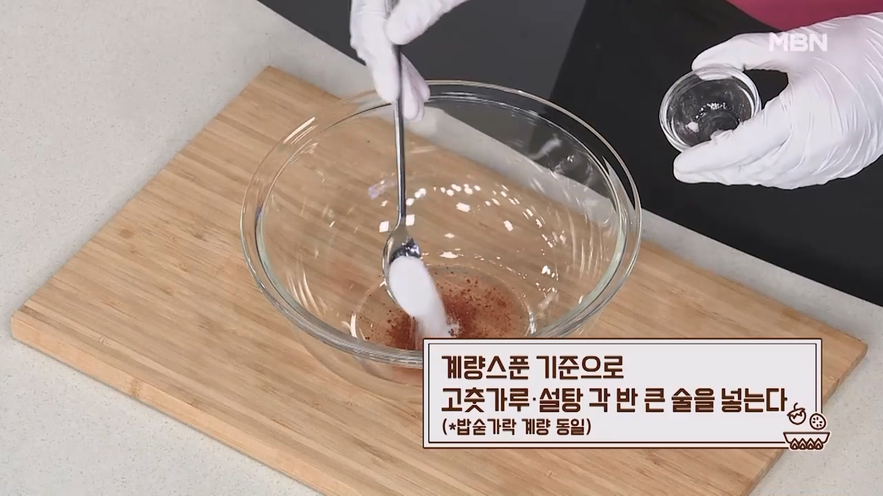22. 볼에 계량스푼 기준으로 고춧가루 반큰술, 설탕 반큰술을 넣습니다. (밥숟가락 계량 동일)