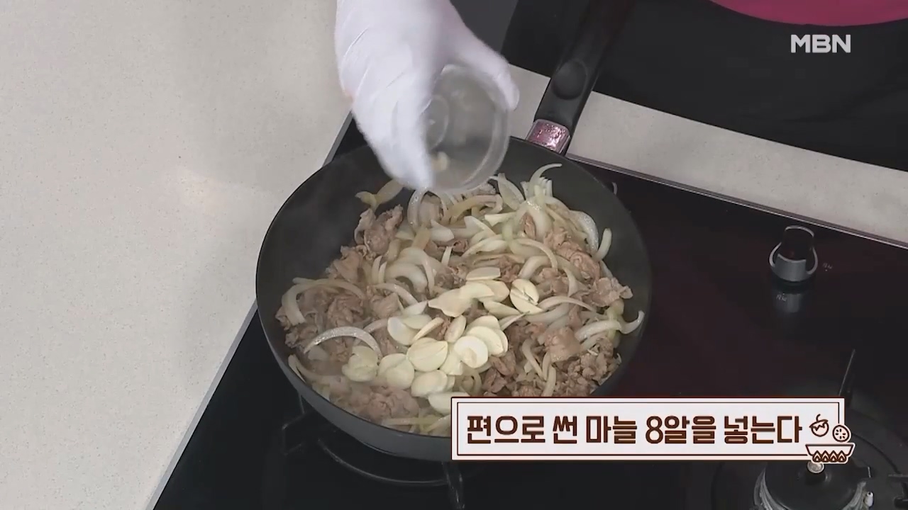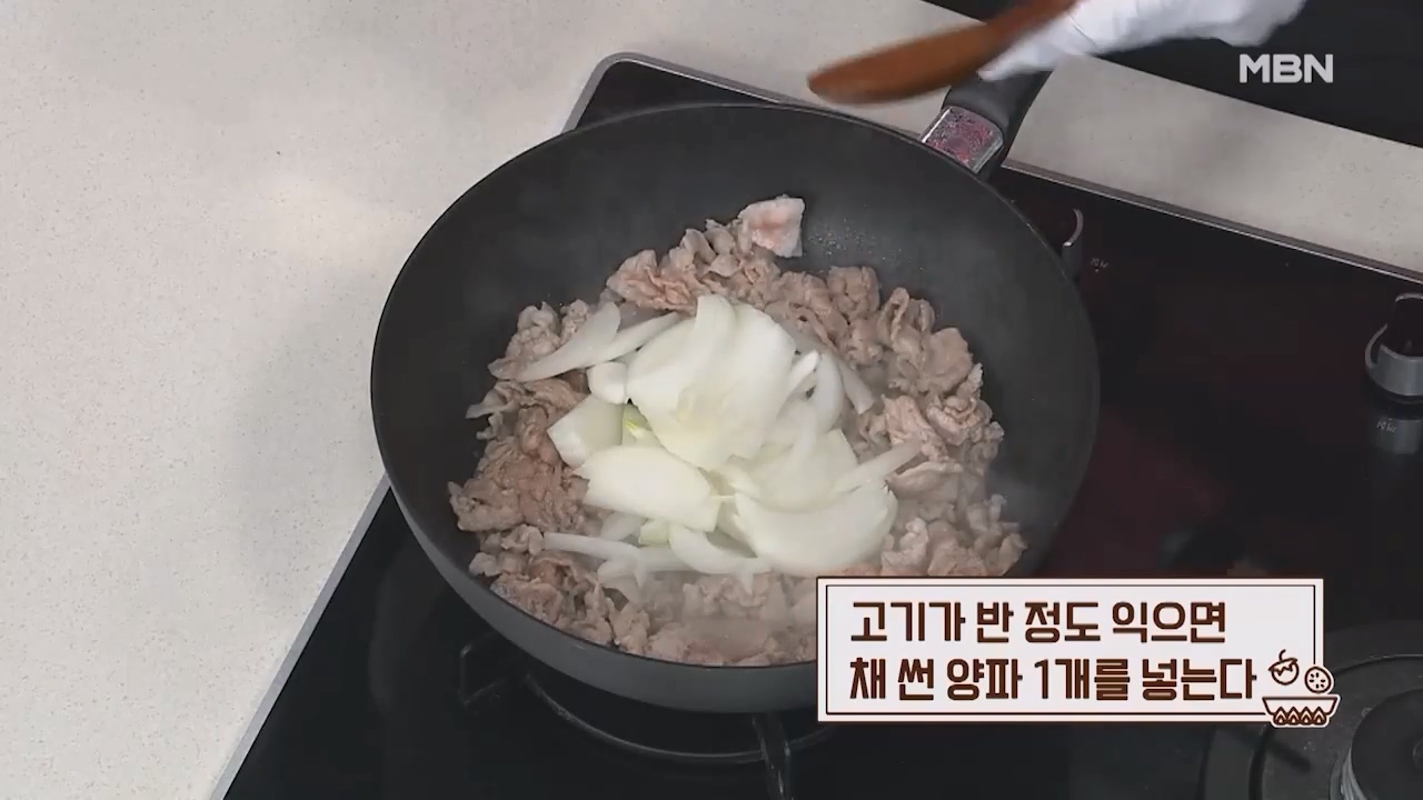 18. 고기가 반 정도 익으면 채 썬 양파 1개를 넣습니다.