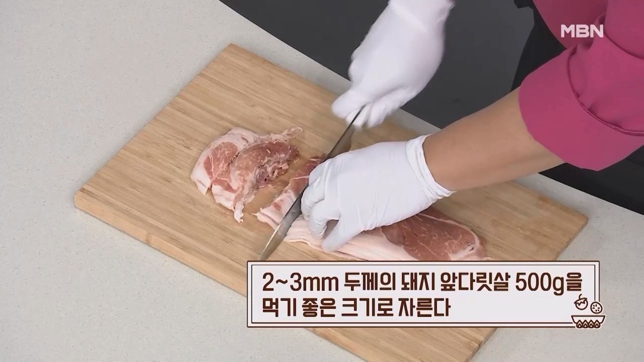 1. 2~3mm 두께의 돼지 앞다릿살 500g을 먹기 좋은 크기로 잘라줍니다.