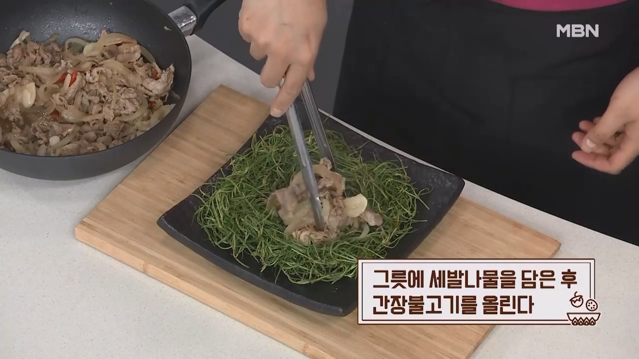 27. 그릇에 세발나물을 담은 후 간장불고기를 올리면 맛있는 간장불고기가 완성됩니다.