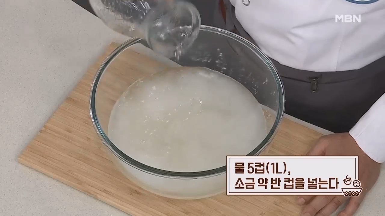 5. 물 5컵(1리터), 소금 약 반컵을 넣습니다.