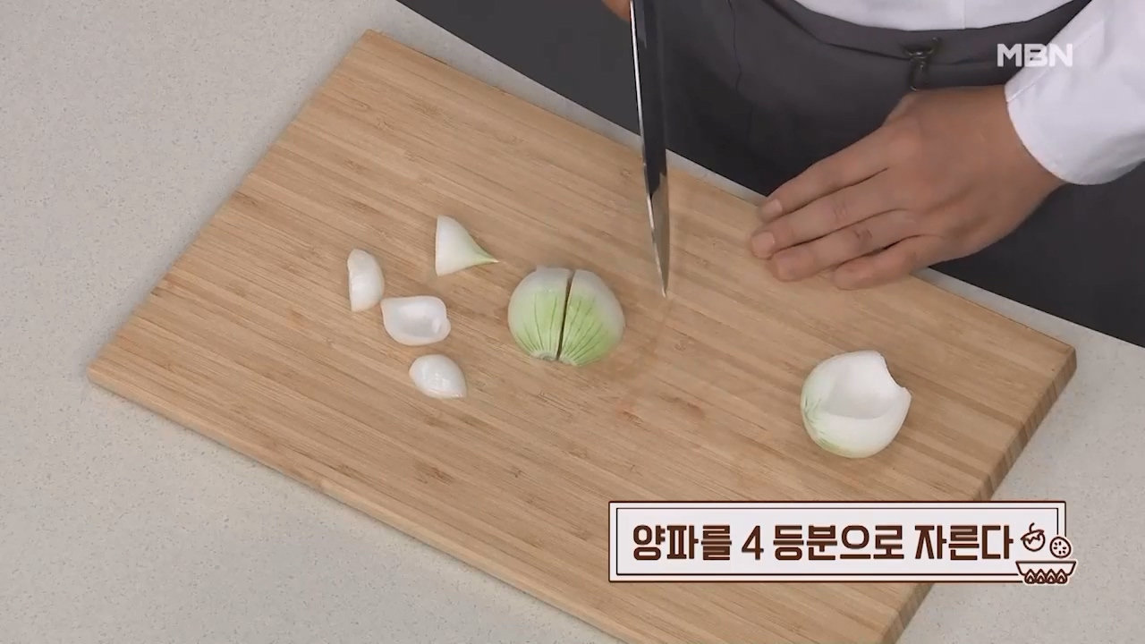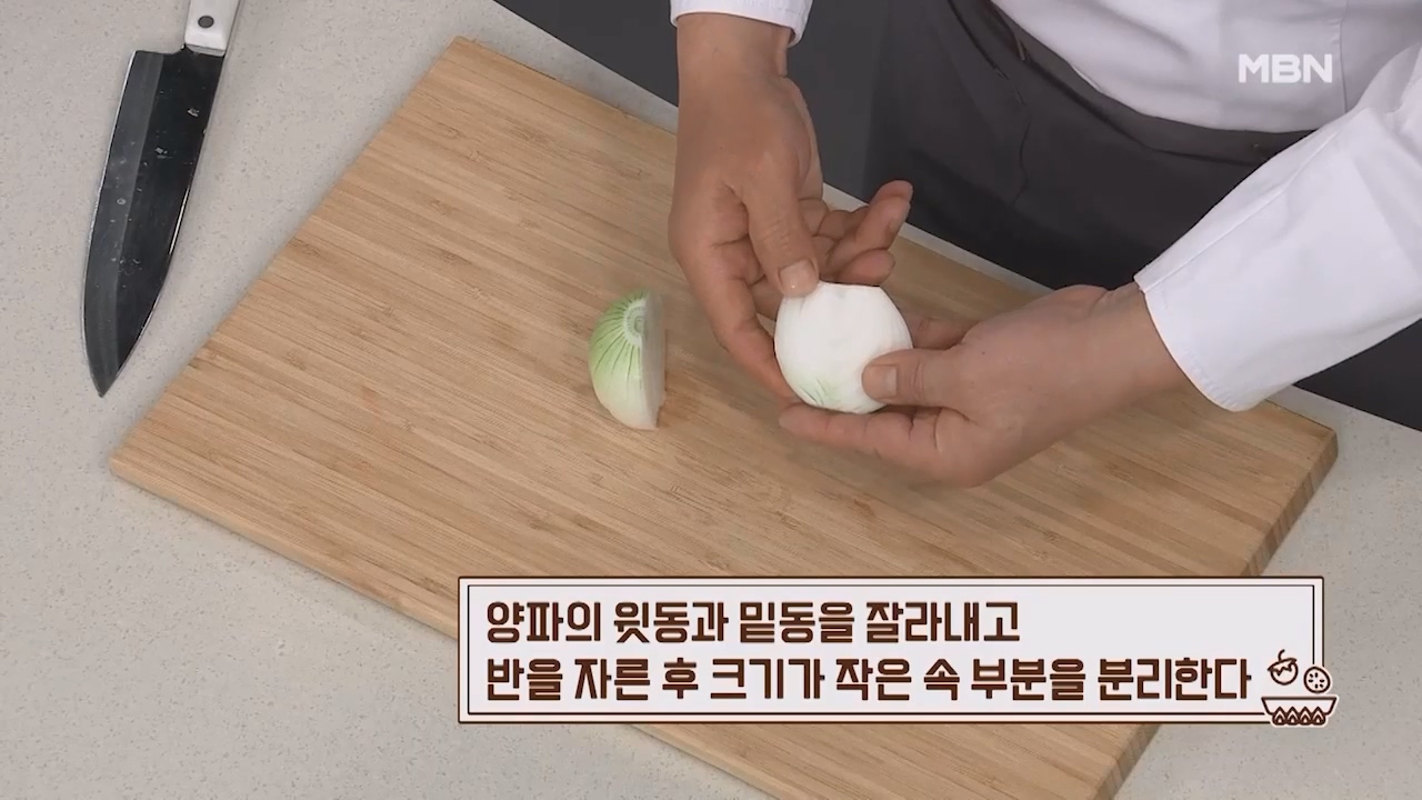 1. 양파의 윗동과 밑동을 잘라내고 반을 자른 후 크기가 작은 속 부분을 분리합니다.