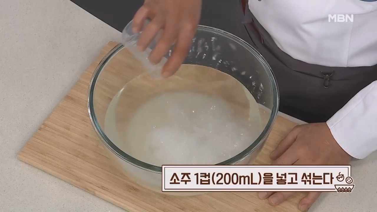 6. 소주 1컵(200mL)을 넣고 잘 섞어줍니다.