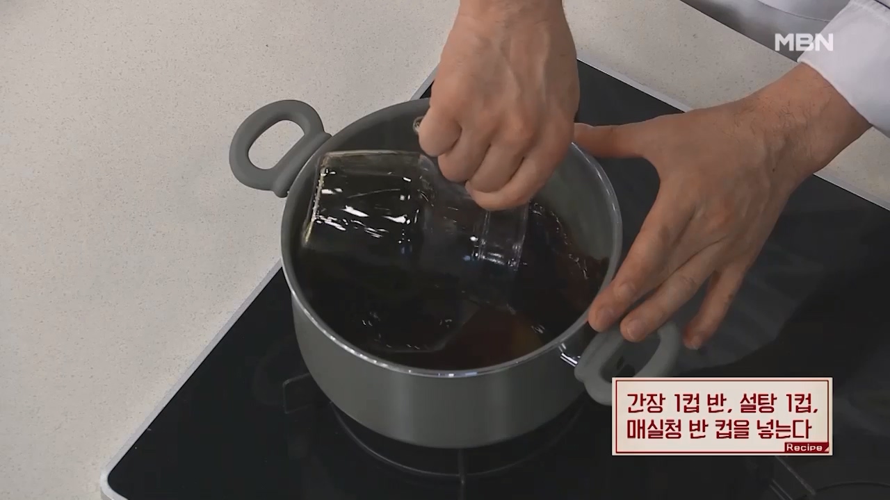 6. 냄비에 간장 1컵반, 설탕 1컵, 매실청 반컵을 넣습니다.