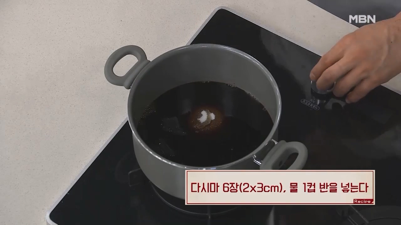 7. 다시마 6장(2x3cm), 물 1컵 반을 넣습니다.