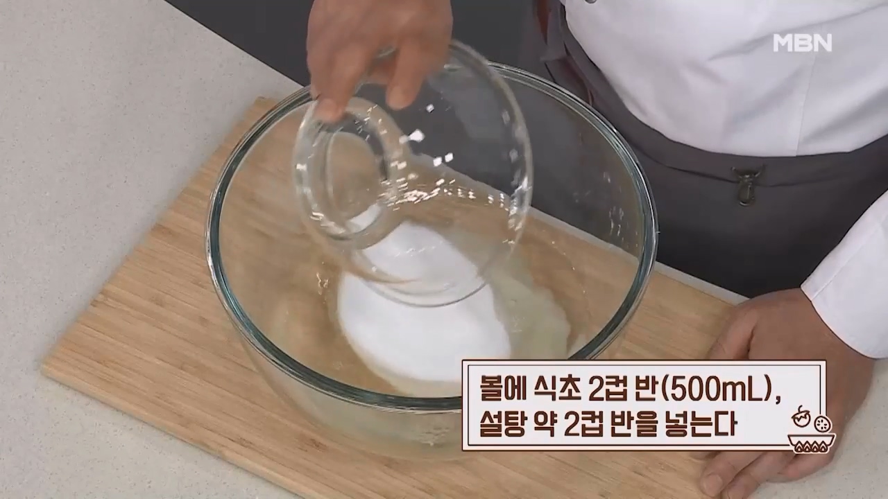4. 볼에 식초 2컵반(500mL), 설탕 약 2컵반을 넣습니다.