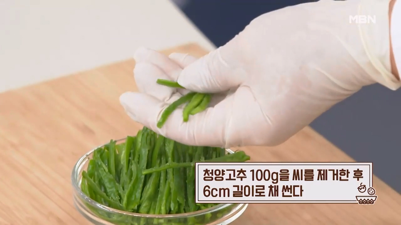 2. 청양고추 100g을 씨를 제거한 후 6cm 길이로 채 썰어줍니다.