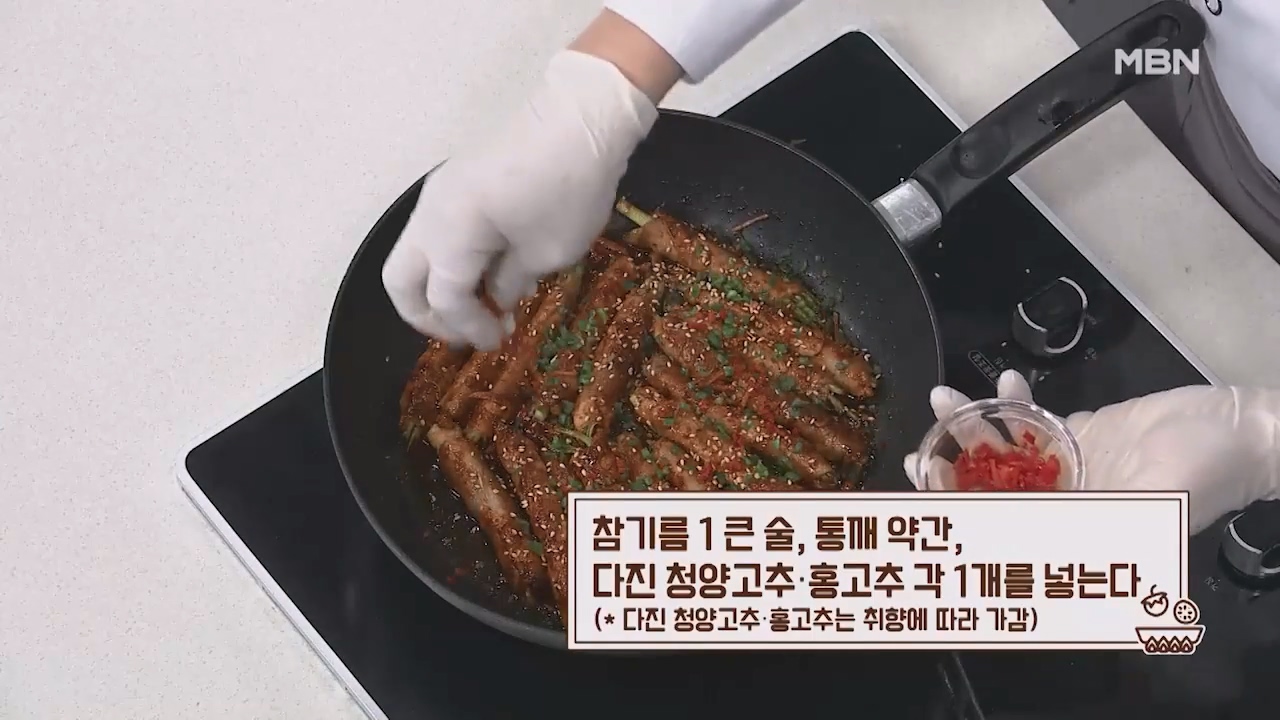 13. 참기름 1큰술, 통깨 약간, 다진 청양고추 1개, 다진 홍고추 1개를 넣습니다. (다진 청양곷,와 홍고추는 취향에 따라 가감합니다.)