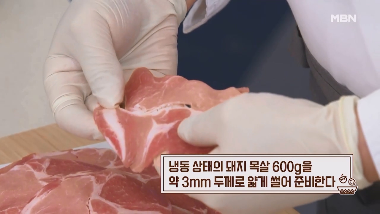 2. 냉동 상태의 돼지목살 600g을 약 3mm 두께로 얇게 썰어 준비합니다.