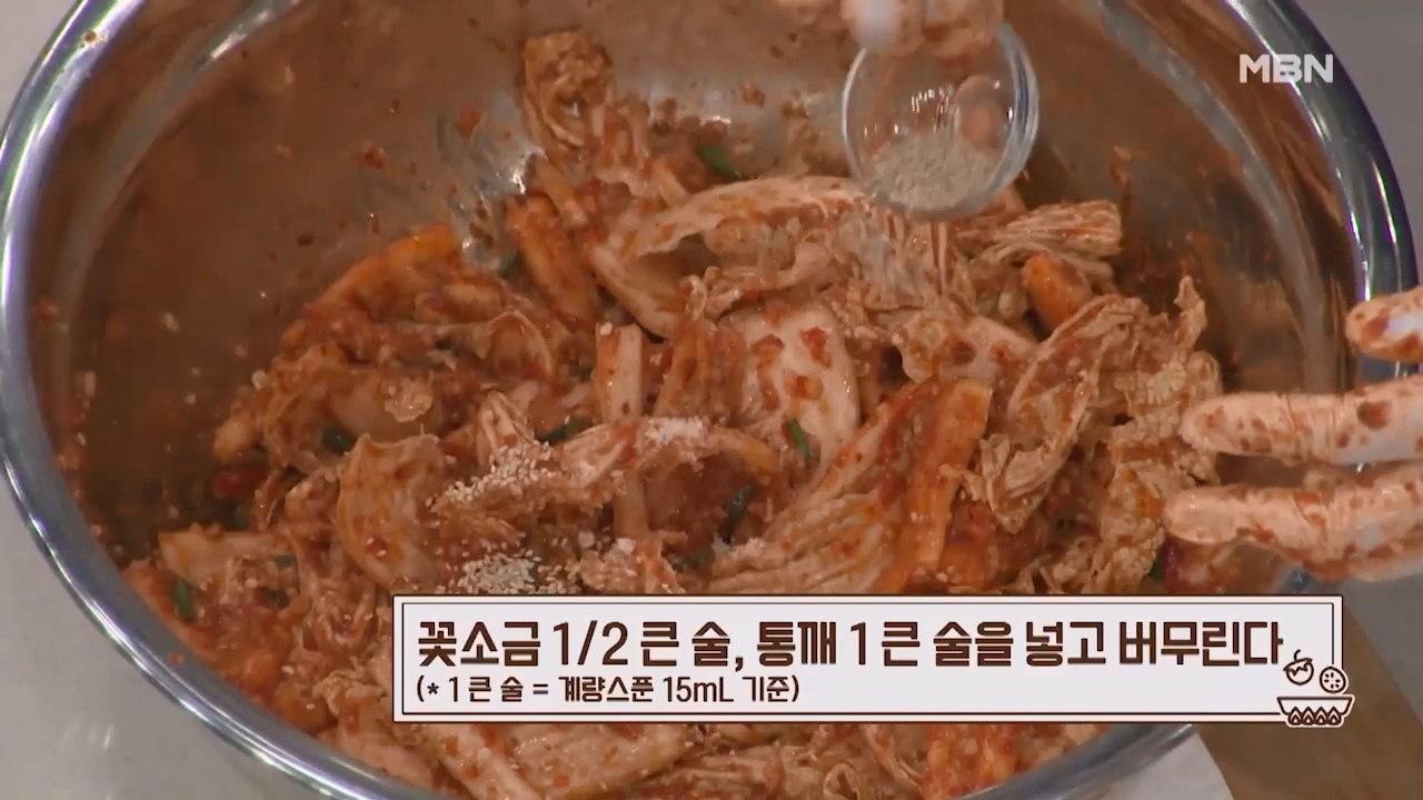 18. 꽃소금 1/2큰술, 통깨 1큰술을 넣고 버무리면 맛있는 배추더덕김치가 완성됩니다. (1큰술은 계량스푼 15mL 기준)