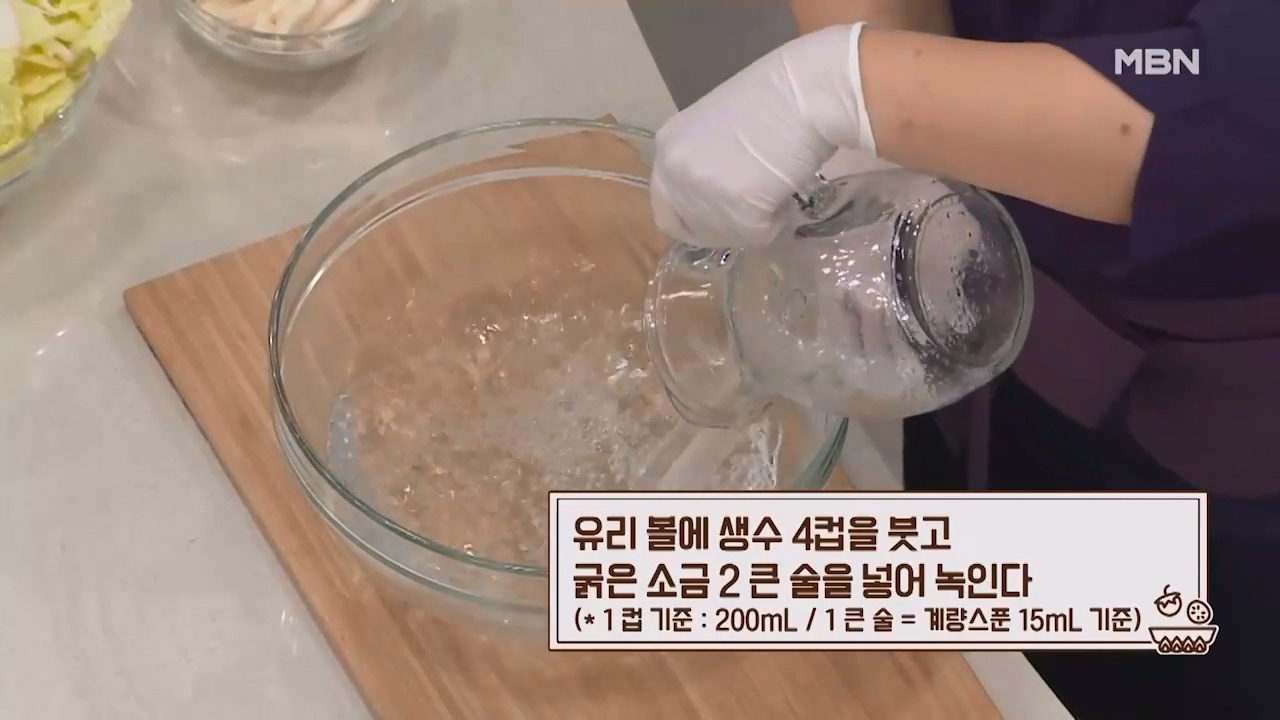 2. 볼에 생수 4컵을 붓고 굵은 소금 2큰술을 넣어 잘 녹여줍니다. (1컵 기준 200mL, 1큰술은 계량스푼 15mL 기준)