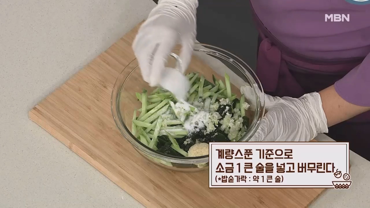 14. 계량스푼 기준으로 볶은 소금 반작은 술을 넣으면 맛있는 미역냉국이 완성됩니다. (티스푼 약 반작은술)