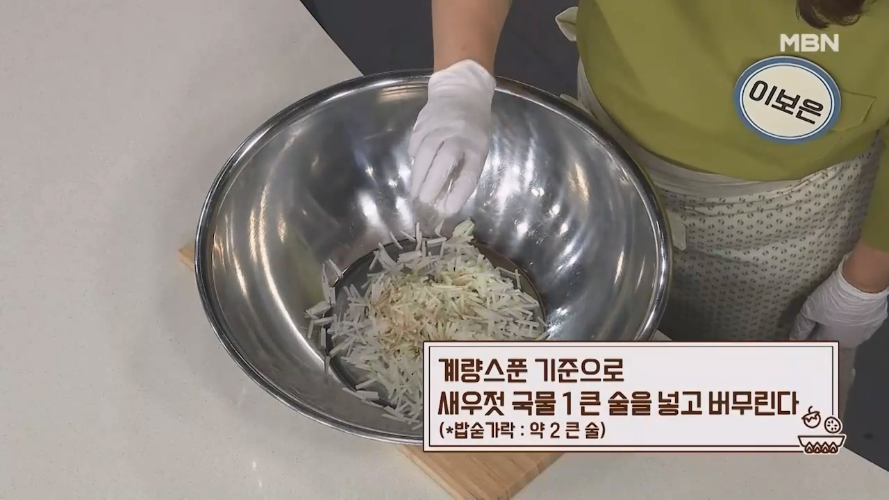14. 계량스푼 기준으로 새우젓 국물 1큰술을 넣고 버무립니다. (밥숟가락 약 2큰술)