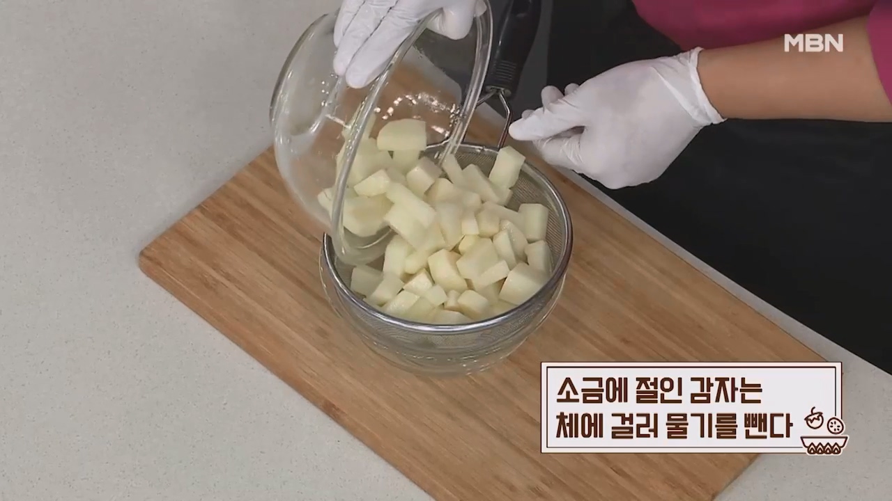 2. 소금에 절인 감자는 체에 걸러 물기를 제거합니다.