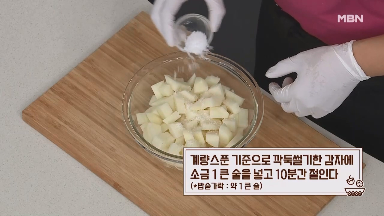 1. 계량스푼 기준으로 깍둑썰기한 감자에 소금 1큰술을 넣고 10분간 절입니다. (밥숟가락 약 1큰술)